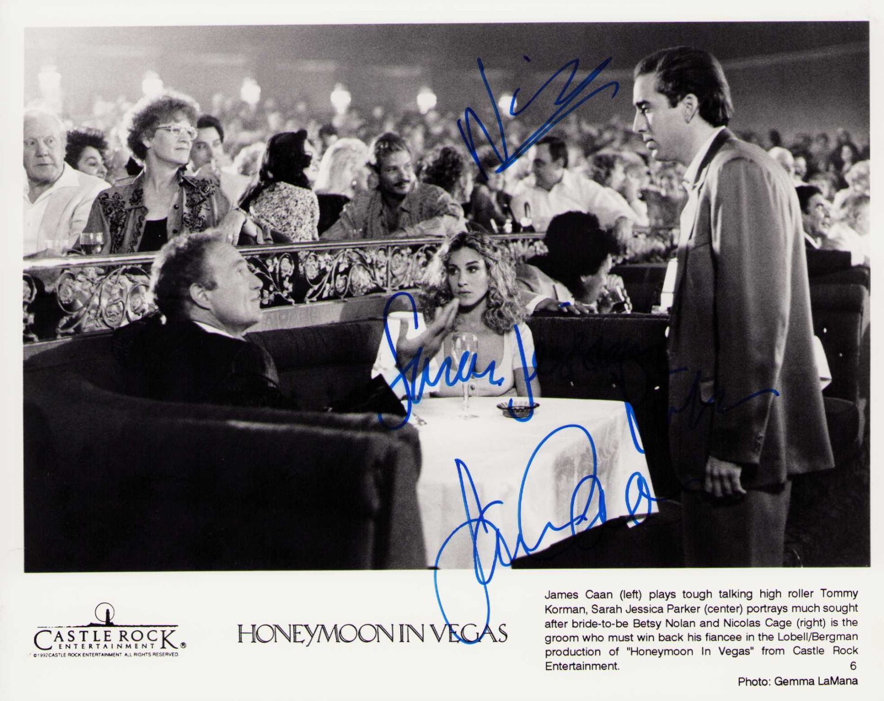A BW 8x10 photo signed by Caan, Cage, and Parker w COA