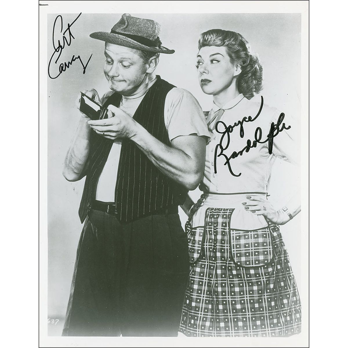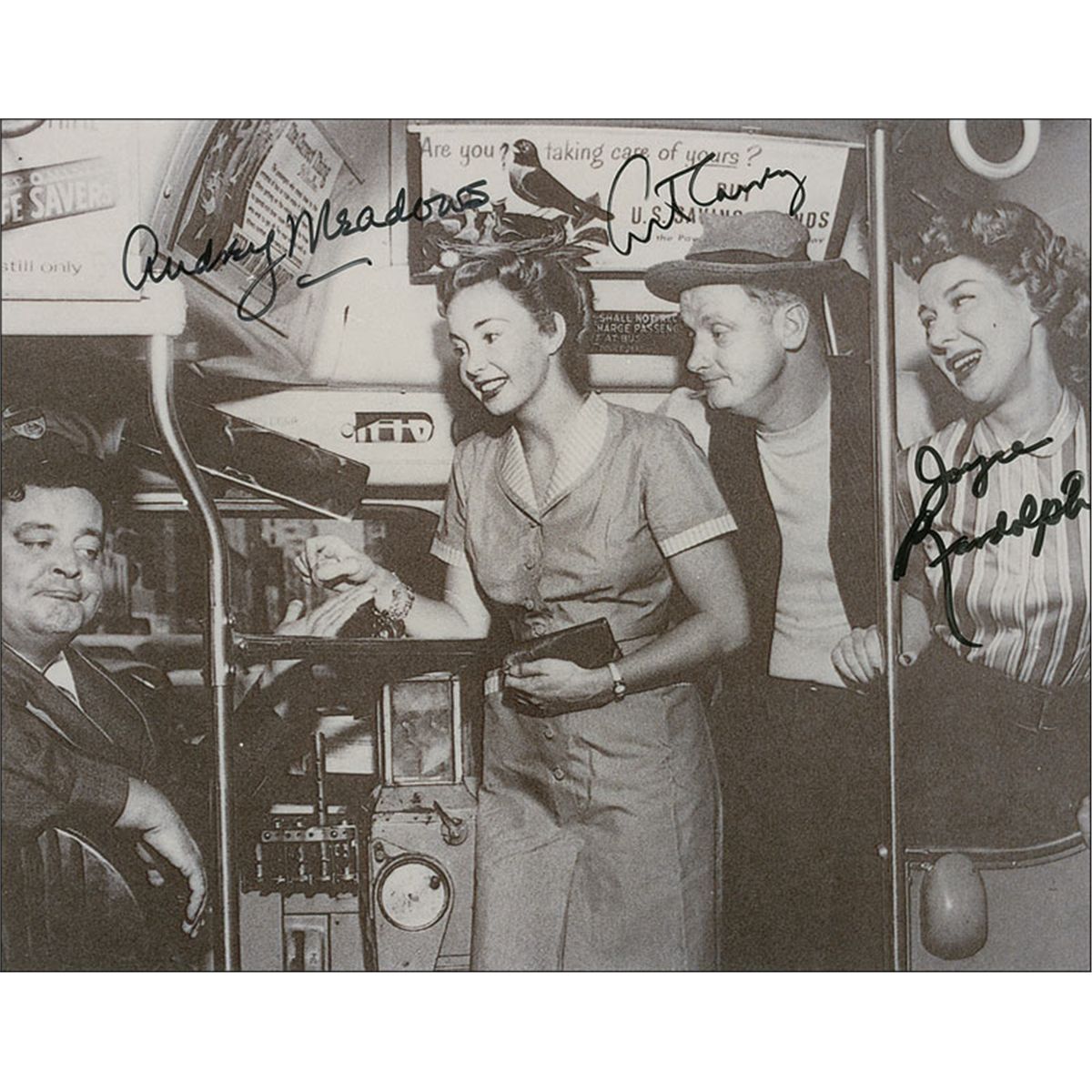 Glossy 8 x 10 photo of Ralph and Trixie, signed in black felt tip by Art Carney and Joyce Randolph; and a glossy 10 x 8 photos of the Cramdens and Nortons on Ralph’s bus, signed in black felt tip by Art Carney, Audrey Meadows, and Joyce Randolph. In fine condition.