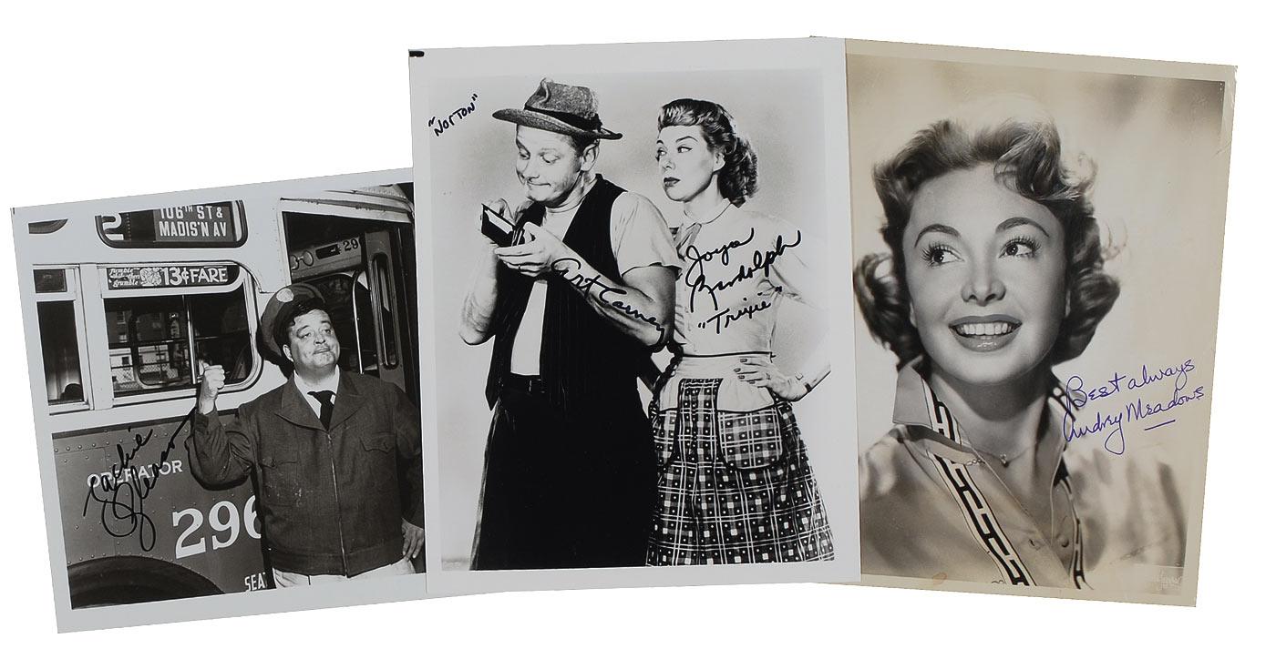 Three 8 x 10 glossy photos of the cast of The Honeymooners, two individually signed in felt tip by Jackie Gleason and Audrey Meadows, and the third signed by Art Carney and Joyce Randolph, both of whom have added their character names. In overall fine condition; Meadows is in very good condition with scattered creasing and surface impressions touching her face. Pre-certified PSA/DNA and RRAuction COA.