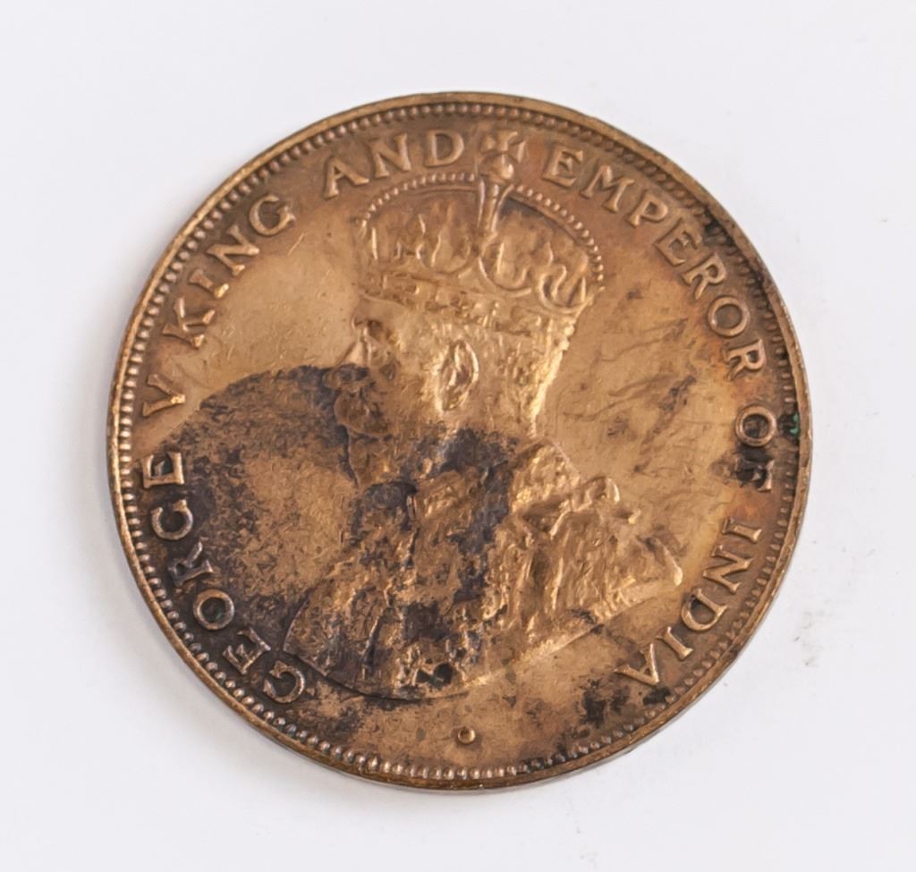 Hong Kong coin. Obverse: Crowned bust facing left. Lettering: GEORGE V KING AND EMPEROR OF INDIA. Reverse: Chinese value within beaded circle, date lower right. Lettering (romanized): HONG-KONG / XIANG GANG YI XIAN / ONE CENT 1926.