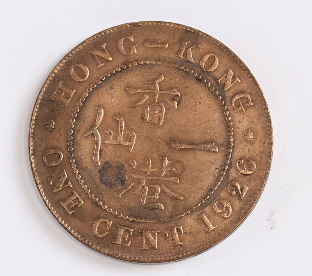 Hong Kong coin. Obverse: Crowned bust facing left. Lettering: GEORGE V KING AND EMPEROR OF INDIA. Reverse: Chinese value within beaded circle, date lower right. Lettering (romanized): HONG-KONG / XIANG GANG YI XIAN / ONE CENT 1926.