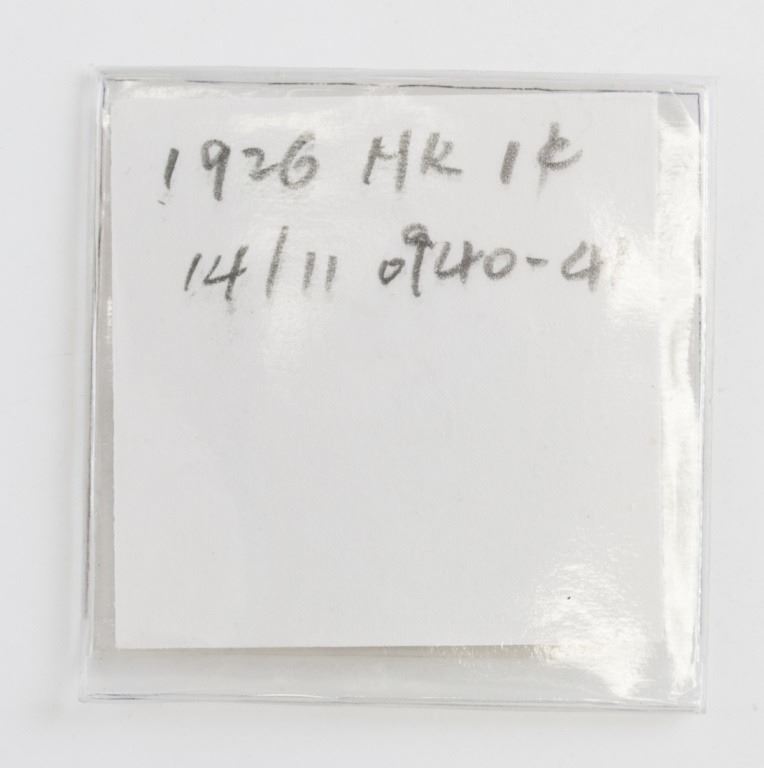Hong Kong coin. Obverse: Crowned bust facing left. Lettering: GEORGE V KING AND EMPEROR OF INDIA. Reverse: Chinese value within beaded circle, date lower right. Lettering (romanized): HONG-KONG / XIANG GANG YI XIAN / ONE CENT 1926.