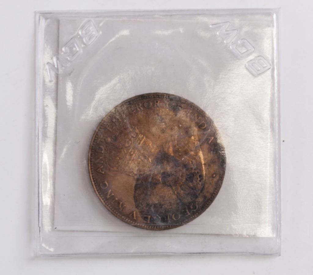 Hong Kong coin. Obverse: Crowned bust facing left. Lettering: GEORGE V KING AND EMPEROR OF INDIA. Reverse: Chinese value within beaded circle, date lower right. Lettering (romanized): HONG-KONG / XIANG GANG YI XIAN / ONE CENT 1926.