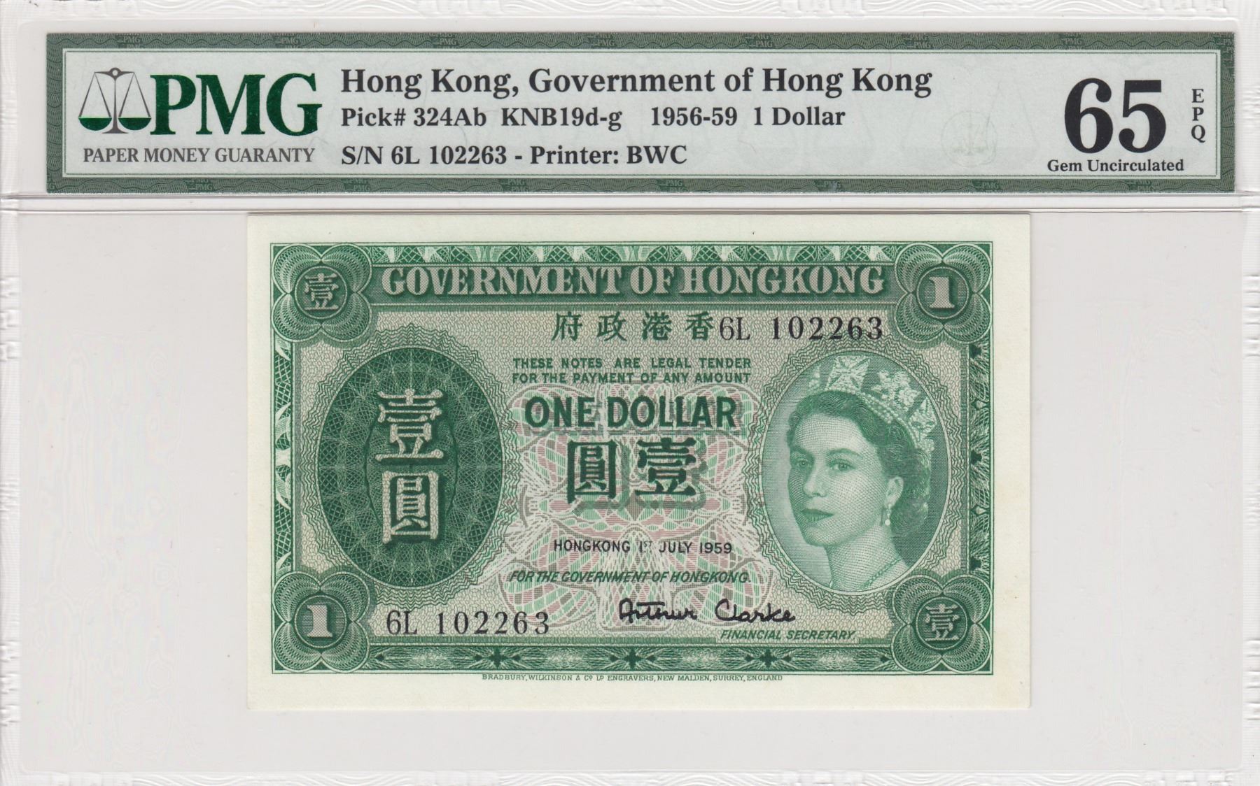 Hong Kong, 1 Dollar, 1959, UNC, p324Abbr/PMG 65 EPQ, Queen Elizabeth II portrait, serial number: 6L 102263