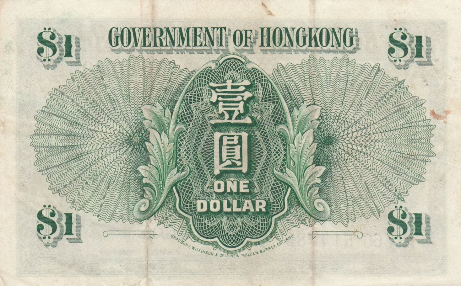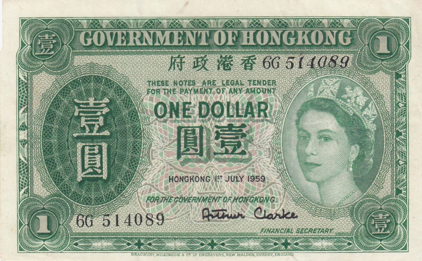 Hong Kong, 1 Dollar, 1959, XF, p324Abbr/Queen Elizabeth II Portrait at right, Serial No: 6G 514089