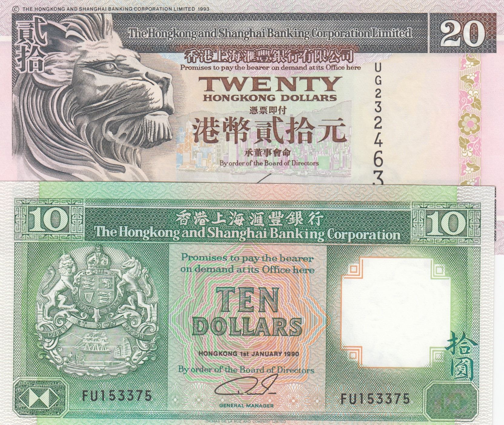 Hong Kong, 10 Dollars and 20 Dollars, 1990/2002, UNC, p191c, p201d, (Total 2 banknotes)br/serial numbers: FU 153375 and UG 232463