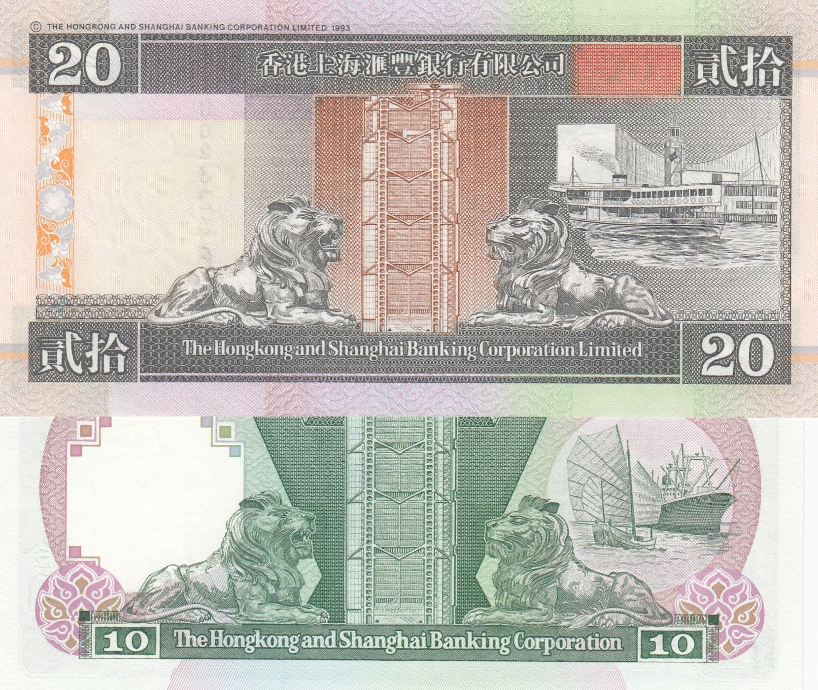 Hong Kong, 10 Dollars and 20 Dollars, 1990/2002, UNC, p191c, p201d, (Total 2 banknotes)br/serial num