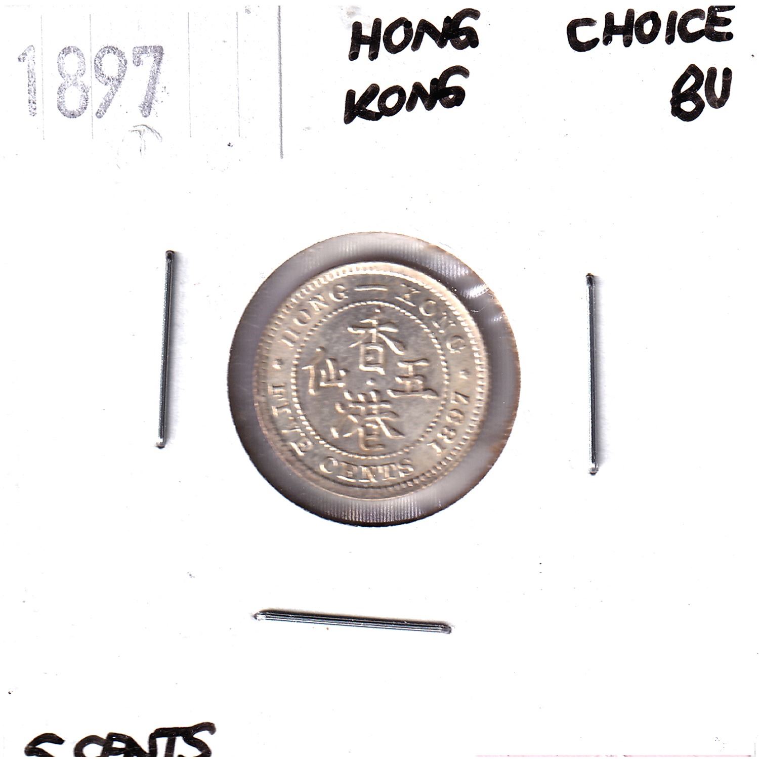 1897 Hong Kong Silver 5-cent, Queen Victoria in Choice BU Condition. An interesting die crack on obverse through the "O" in Victoria.