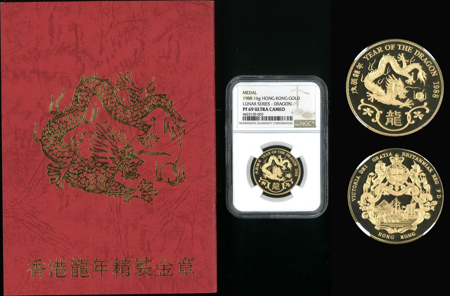 1988, 香港生肖系列- 龍年精鑄金章 (總金重: 0.4708 盎司), 附發行證書, 已評NGC Proof - 69 Ultra Cameo。龍年生肖為收藏者最為喜愛的生肖。1988 龍年更是香港回歸前最後一 個龍年, 章背面設計為英徽 (阿群帶路圖), 令此章帶來多一層收藏意義。