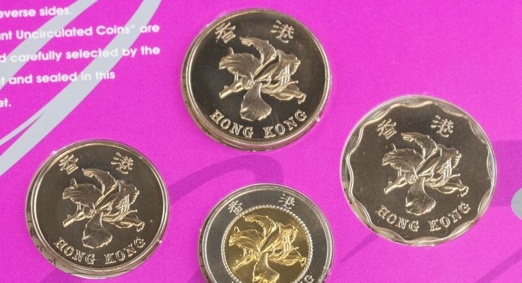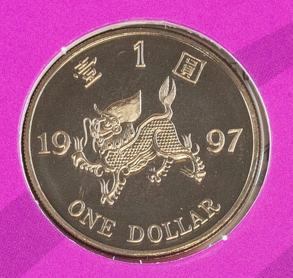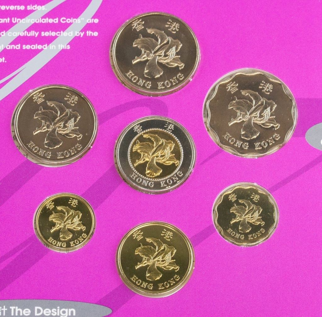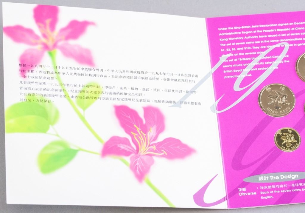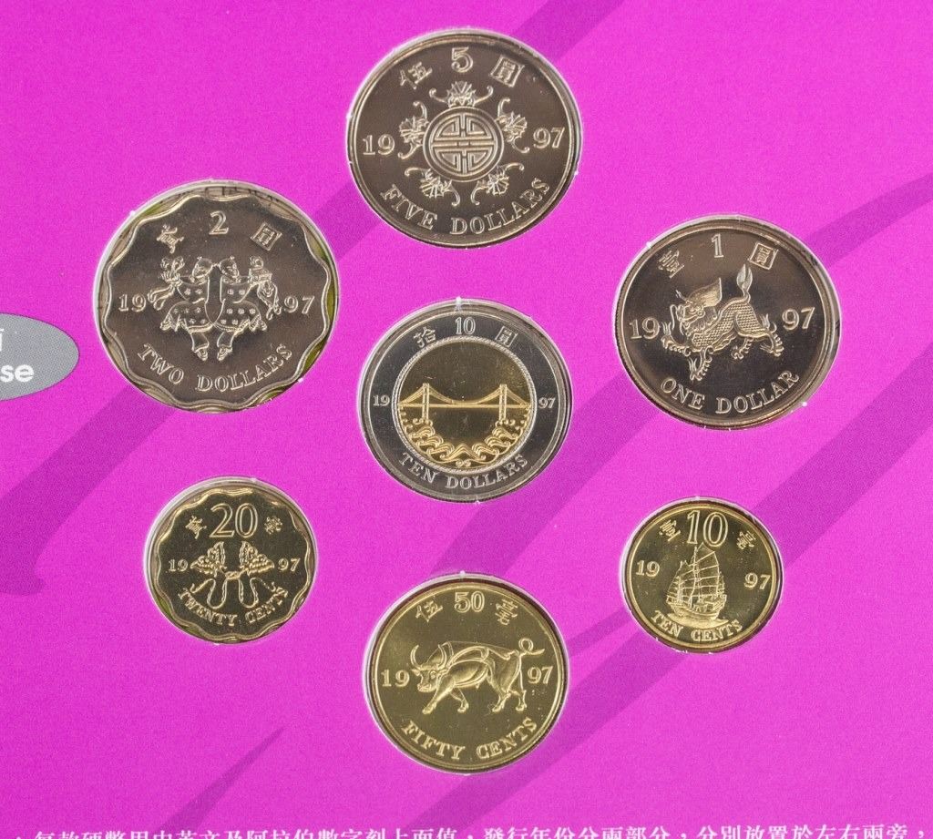 Hong Kong coins. Issued in 1997 to commemorate Hong Kong's return to China. Featuring 7 coins of different denominations. 15 x 16 cm. 107 grams.