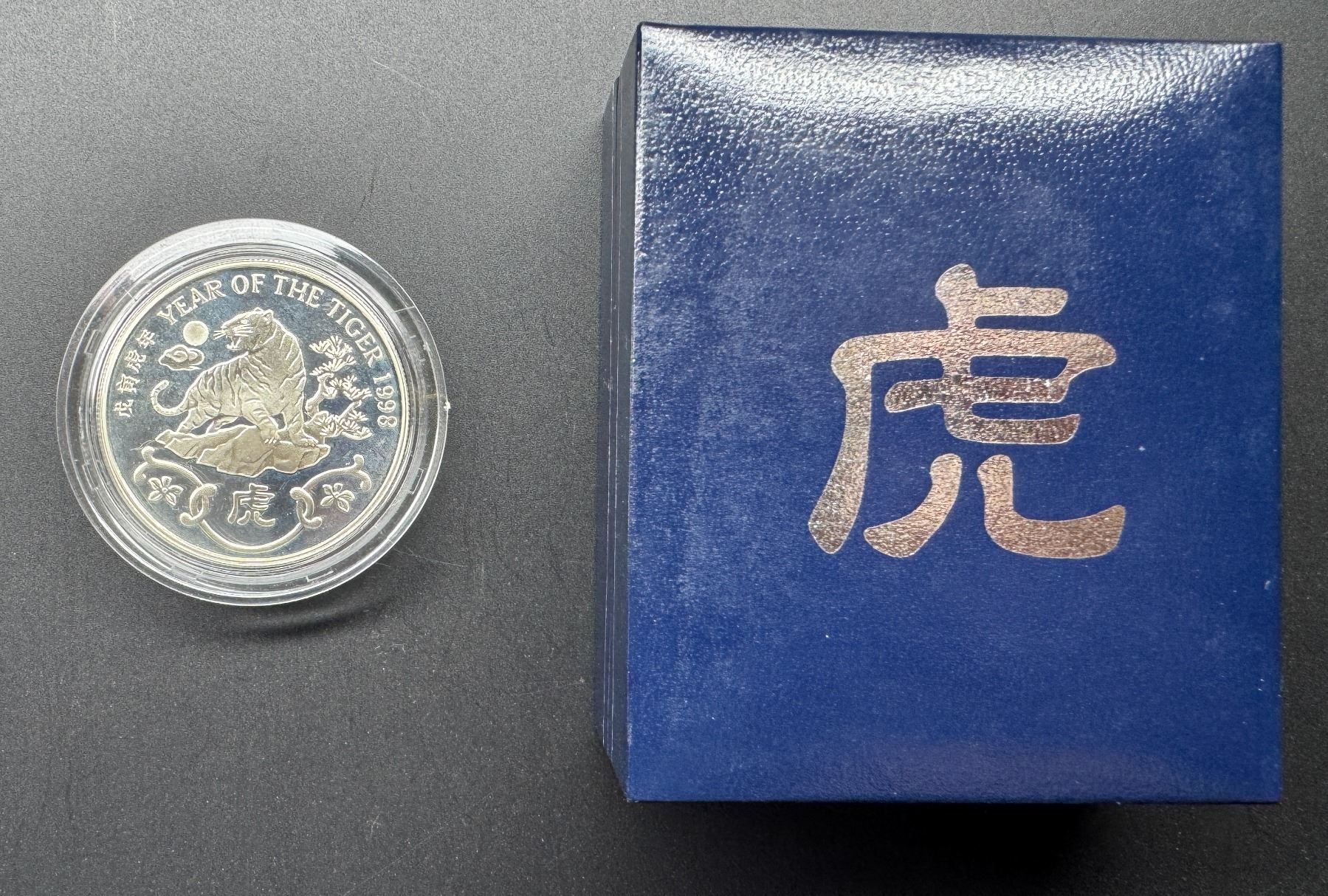 Hong Kong, 1998, Lunar Series, Year of the Tiger, 1 oz Silver Medal. Includes original box of issue.