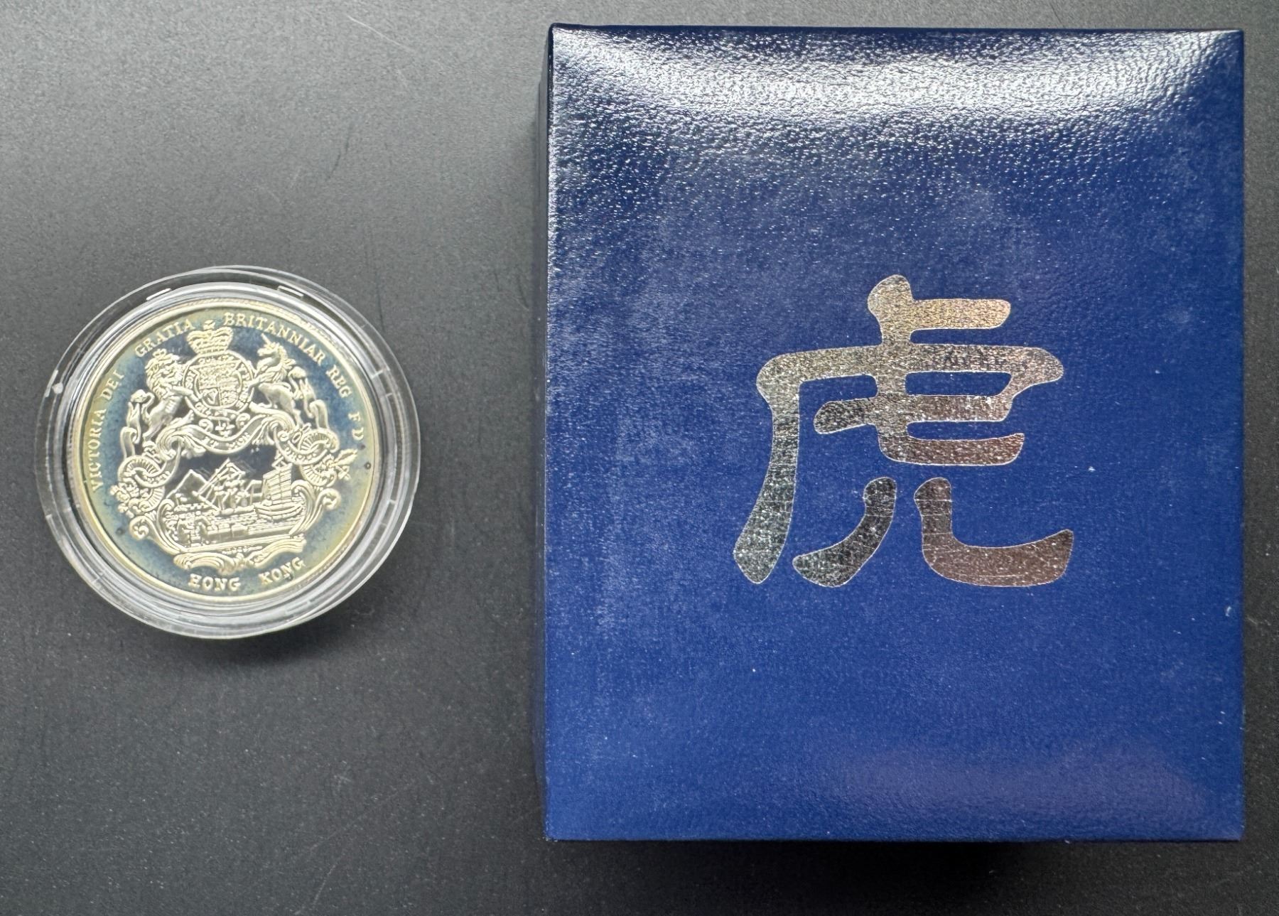 1988, 香港生肖系列- 虎年精鑄 1盎司銀章 (總銀重:, 附發行原盒, 章背面設計為英徽 (阿群帶路圖)。