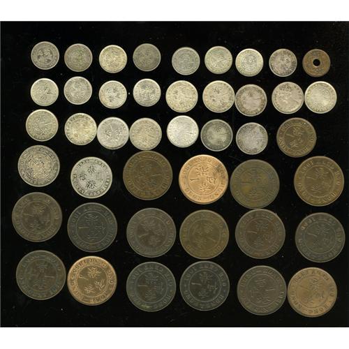 <B>Assorted Dates and Types Collection, </B></I>forty-five coins featuring: Mil 1863 brown VF-XF; Cent 1863 cleaned VF-XF, 1865 AVF and cleaned VF-XF, 1875 VF, 1876 VF, 1879 F-VF, 1880 brown XF, scarce grade, 1881 VF+, 1899 F-VF, 1900H XF with some luster, 1901H VF and lustrous AU-UNC, 1902 XF tiny nick, 1903 VF-XF, 1904H glossy brown XF, 1905H brown AXF and 1933 AU; 5 Cents 1885 AVF and VF, 1888 VF, 1889H VF and AXF, 1891 F-VF, 1895 XF, 1897 XF-AU and AU-UNC, 1899 XF, 1901 AU-UNC and 1904 XF scratches; 10 Cents 1866 VF-XF rim bruise, 1867 cleaned XF, scarce, 1879 VF+, 1881 toned VF-XF, 1888 AVF and XF, 1893 VF, 1894 AU and nicely toned UNC, 1895 VF, 1896 XF, 1898 XF and 1900H cleaned AU; 20 Cents 1866 F/VG and 1893 toned AVF. A great starter collection of this highly popular series with a good variety of dates and decidedly collectible grades. Prices listed in the SCWC totaling $515 are now outdated for Hong Kong. <B>Sold as is, no return lot.</B></I><BR><BR><b>Shipping:</b> Coins & Currency (<a target="_blank" href="http://www.heritageauctions.com/common/shipping.php">view shipping information</a>)