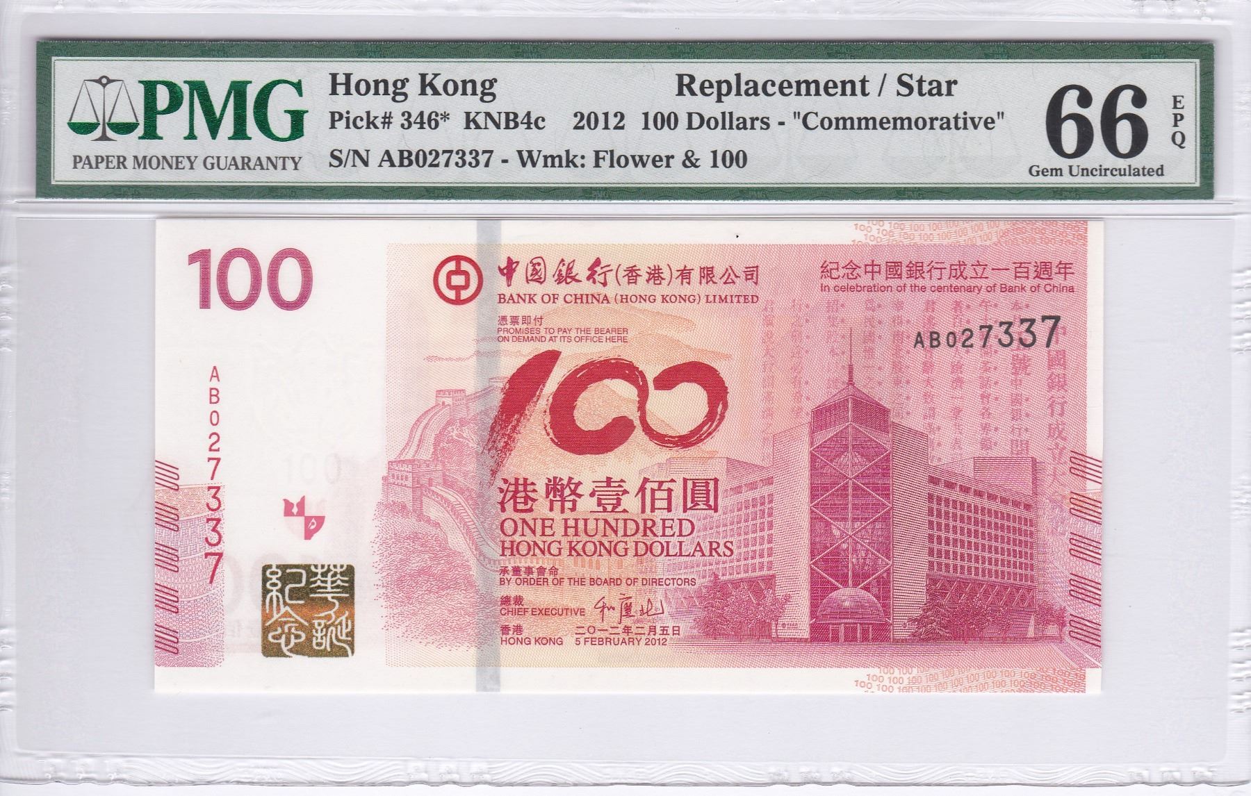 2012, 香港中國銀行, $100, 編號: AB027337. PMG 66EPQ. 紀念鈔, 補版