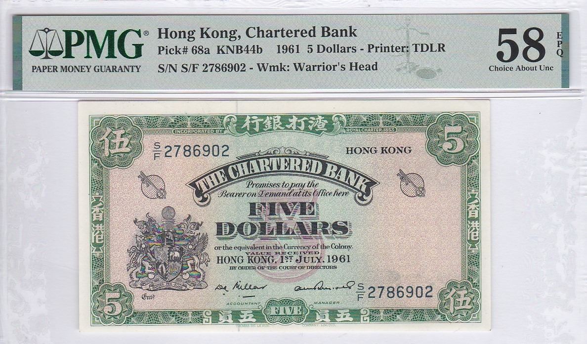 Hong Kong, Chartered Bank, 5 dollars, 1961, S/N. S/F2786902, P-68a, PMG 58EPQ Keydate of this series