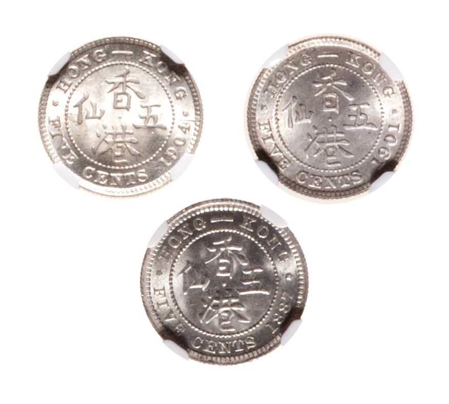 Hong Kong. Lot of three (3) NGC Graded Gem Uncirculated silver 5 Cents, including: 1887 MS-65; 1901 MS-66; 1904 MS-65.