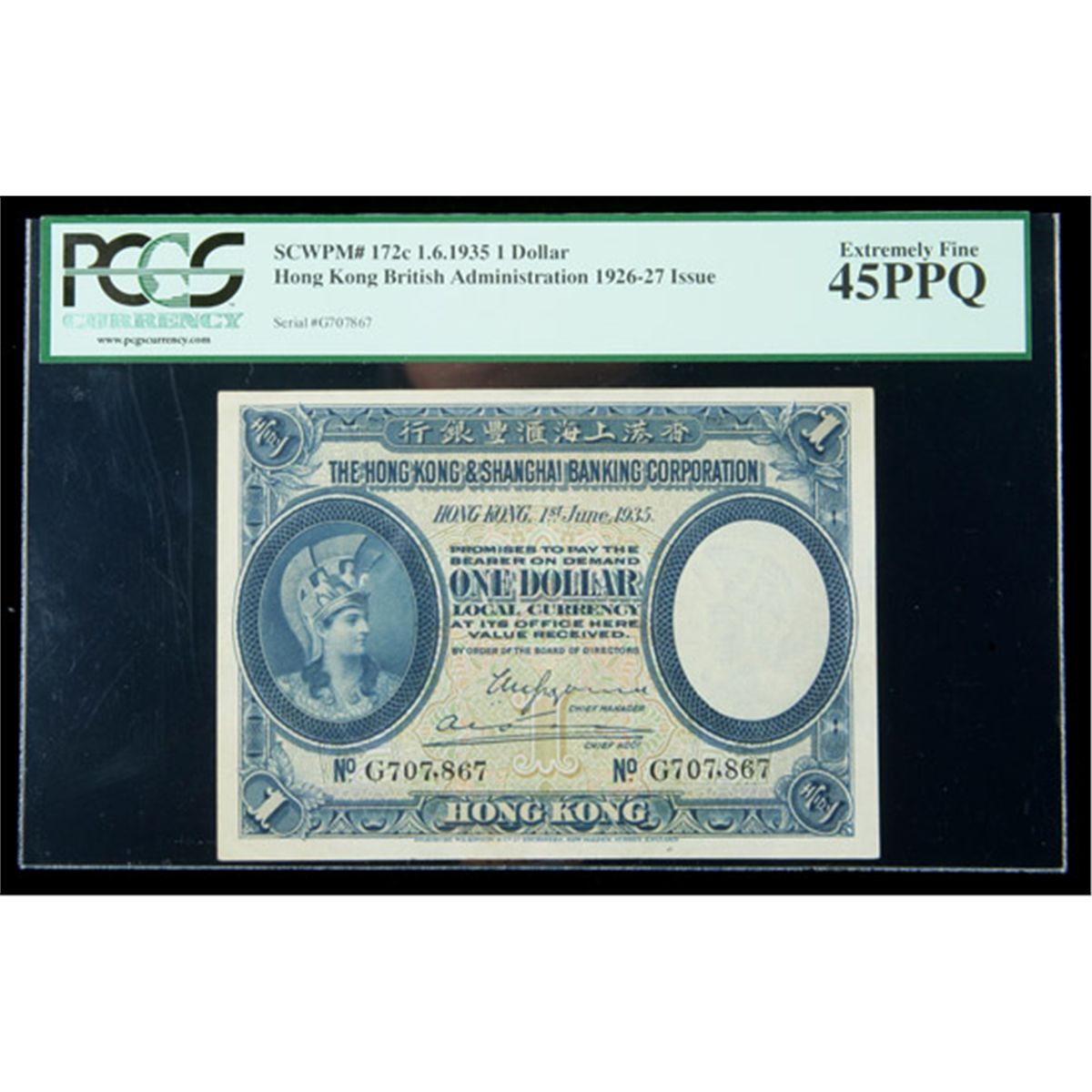 Hong Kong SCWPM# 172c, 1.6.1935 1 Dollar. PCGS Extremely Fine 45PPQ. . Fr-P-172c. Fresh and original with only light handling.