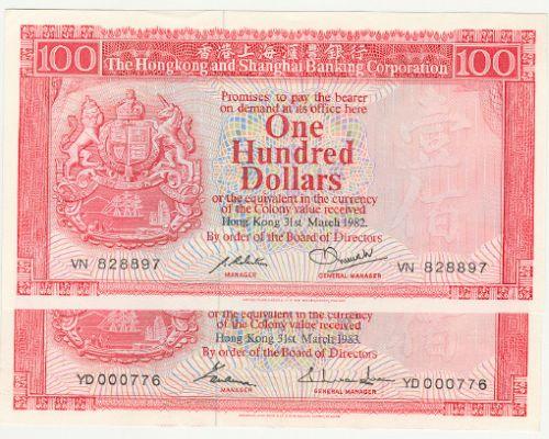 Hong Kong, The Hong Kong and Shanghai Banking Corporation Limited, 100 dollars, 31st March 1982, AU, serial VN 828897 &. 100 dollars, 31st March 1983, EF, serial YD 000776. Pick number 187d.