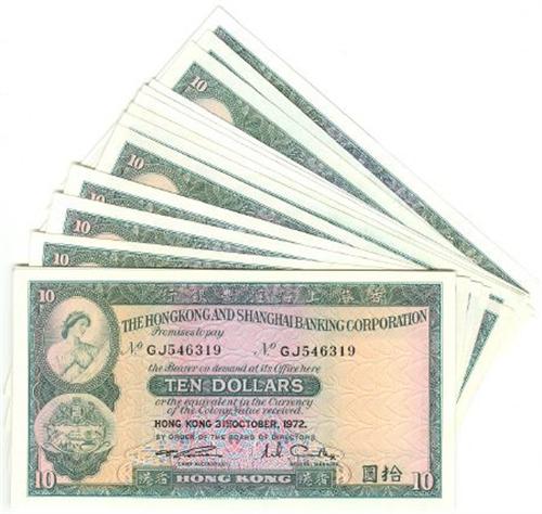 Hong Kong, The Hong Kong and Shanghai Banking Corporation Limited, 19 x 10 dollars, 31st October 1972, 1 EF & 18 UNC. Pick number 182g. Lot of 19 notes.