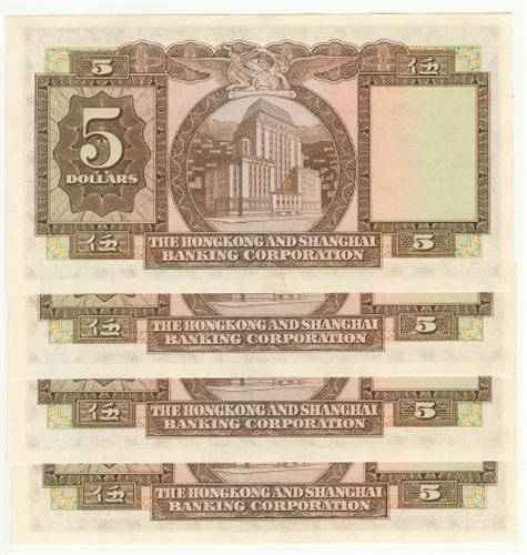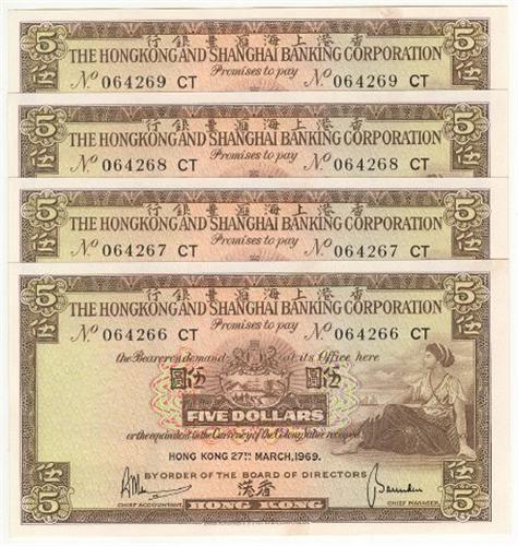Hong Kong, The Hong Kong and Shanghai Banking Corporation Limited, 4 consecutives 5 dollars, 27th March 1969, UNC, serial 064266 -67-68-69 CT. Pick number 181c.