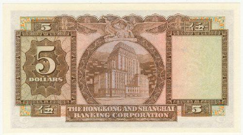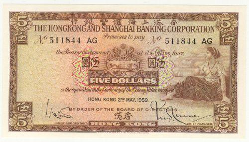 Hong Kong, The Hong Kong and Shanghai Banking Corporation Limited, 5 dollars, 2nd Mai 1959, UNC, serial 511844 AG. Pick number 181a.