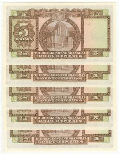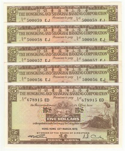 Hong Kong, The Hong Kong and Shanghai Banking Corporation Limited, 5 dollars, 13th March 1972, UNC, serial 678915 ED. 4 consecutives 5 dollars, 31st October 1972, UNC, serial 500056-57-58-59 EJ. Pick number 181e. Lot of 5 notes.