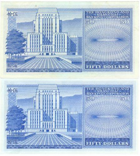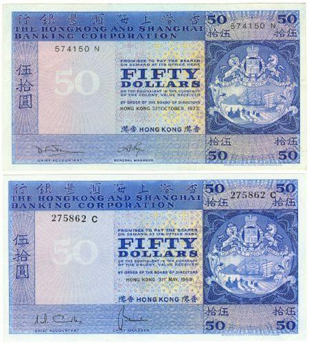 Hong Kong, The Hong Kong and Shanghai Banking Corporation Limited, 50 dollars, 31st May 1968, UNC, serial 275862 C Pick number 184a &. 50 dollars, 31st October 1973, EF, serial 574150 N. Pick number 184b.