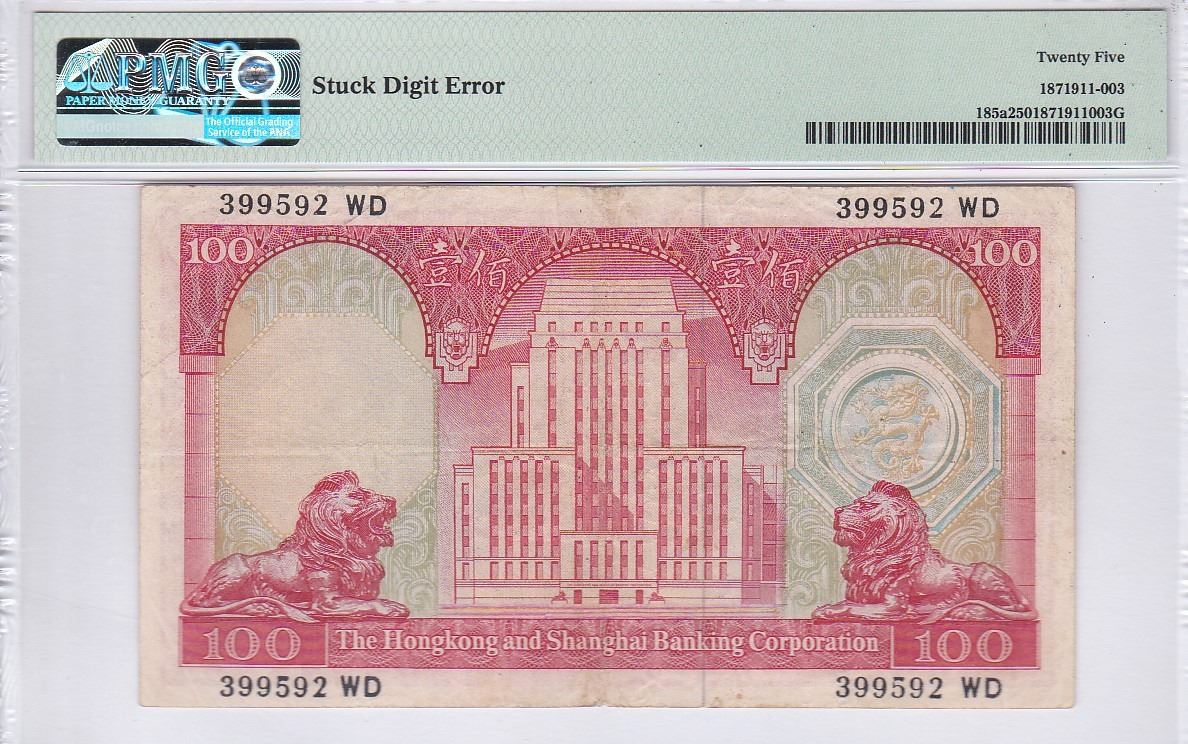Hong Kong, Shanghai Banking Corp, 100 dollars, 1972, S/N. 399592WD Stuck Digit Error, P-185a, PMG 25