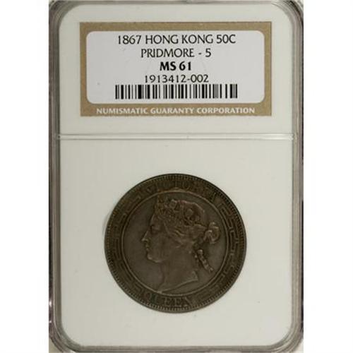 <B>Victoria. Half Dollar 1867,. </B></I> KM8, Prid-5, MS61 NGC. Pewter-gray toning with bluish highlights and underlying luster. An extremely rare issue in Mint State and the finest example we have seen since our sale of the Wayne Palmer Collection.<BR><BR><b>Shipping:</b> Coins & Currency (<a target="_blank" href="http://www.heritageauctions.com/common/shipping.php">view shipping information</a>)