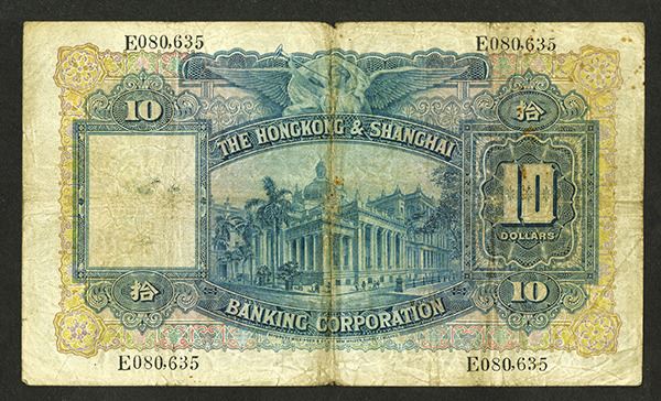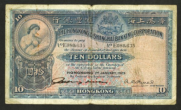 Hongkong, January 1st, 1929, $10, P-174b, Issued Green on m/c, back green, Hand written signature on left, Fine to Choice Fine condition with a strong vertical fold.