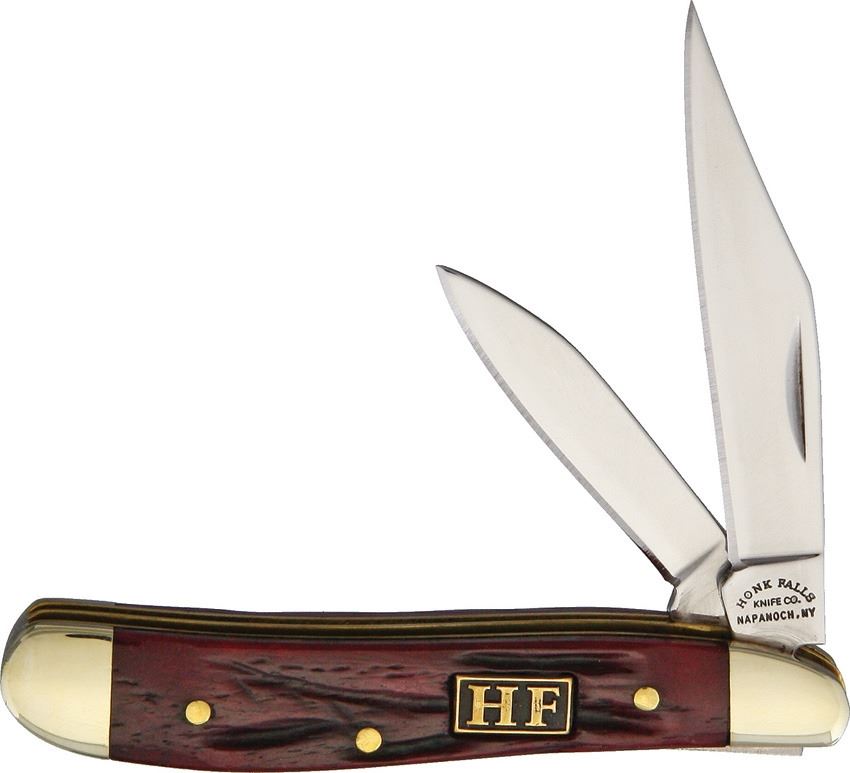 2 3/4" closed. Stainless clip and pen blades. Red pick bone handles with nickel silver bolsters and Honk Falls inlay shield.