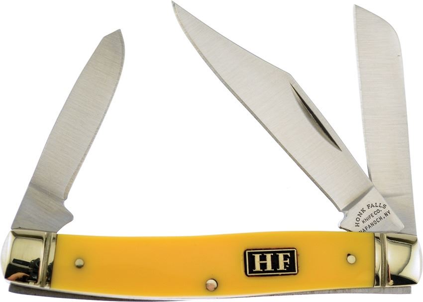 3 7/8" closed. Stainless clip, spey, and sheepsfoot blades. Smooth yellow composition handles with nickel silver bolsters and Honk Falls inlay shield.