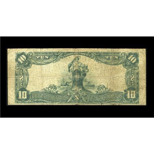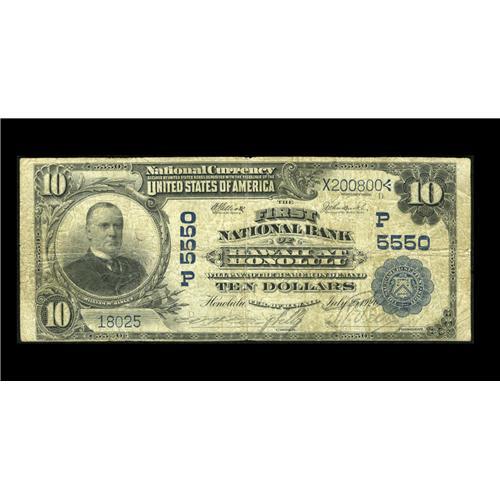 <B>Honolulu, HI</B></I> - $10 1902 Plain Back Fr. 633 <B>The First NB of Hawaii</B></I> Ch. # (P)5550<BR>The $10 denomination from here is measurably scarcer than the $5. Tonight's <B>Very Good</B></I> still displays reasonably strong stamped officers' signatures and would be a candidate for Fine with a bit less circulation soiling.