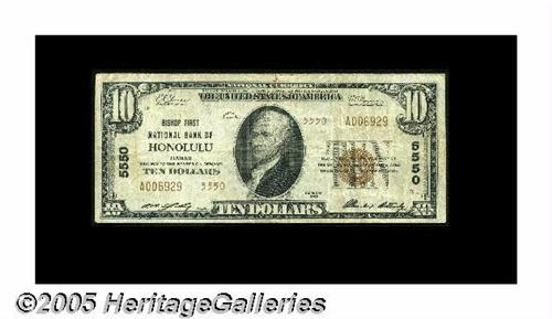 <B>Honolulu, HI</B></I> - $10 1929 Ty. 2 <B>Bishop First NB</B></I> Ch. # 5550<BR>A pleasing Type 2 example with just a few tiny rust spots visible on the reverse. <B>Fine-Very Fine.</B></I>