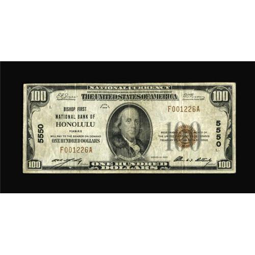 <B>Honolulu, HI</B></I> - $100 1929 Ty. 1 <B>Bishop First NB</B></I> Ch. # 5550<BR> This is the key denomination to any set of the Hawaii 1929 series. While a small hoard of the $50 denomination was dispersed in the early 1980's, the $100's have always been available just one at a time. This <B>Very Fine-Extremely Fine</B></I> example, has a small paper scuff on the front at the lower left mentioned for the sake of accuracy, and should see bids top out at around...<BR><BR><b>Shipping:</b> Coins & Currency (<a target="_blank" href="http://www.heritageauctions.com/common/shipping.php">view shipping information</a>)