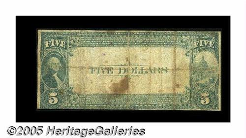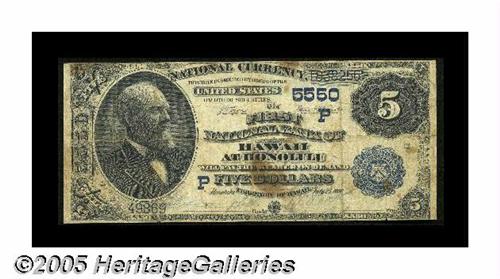 <B>Honolulu, HI</B></I> - $5 1882 Value Back Fr. 574 <B>The First NB of Hawaii at Honolulu</B></I> Ch. # (P)5550<BR>A by no means common type from this much-collected Territory. Closely trimmed <B>Very Good-Fine,</B></I> with a few stains and a couple of minor splits and pinholes.