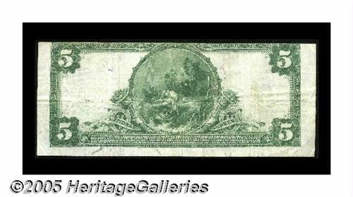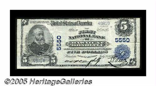 <B>Honolulu, HI</B></I> - $5 1902 Plain Back Fr. 607 <B>The First NB</B></I> Ch. # 5550<BR>An attractive example from the only affordable Territorial issuer, although the supply of large notes from here is steadily dwindling. Pleasing <B>Fine-Very Fine,</B></I> with considerably more claim to the higher grade than the lower. The top is trimmed into the design, as is typical on $5 examples from here, but the signatures are bold and the overall appearance quite pleasing.