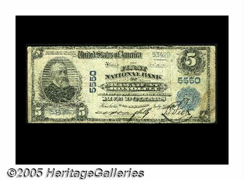 <B>Honolulu, HI</B></I> - $5 1902 Plain Back Fr. 607 <B>The First NB of Hawaii at Honolulu</B></I> Ch. # 5550<BR>A well-circulated but intact example of the only affordable large size Territorial issue. <B>Very Good,</B></I> with a bit of light staining on the right end.