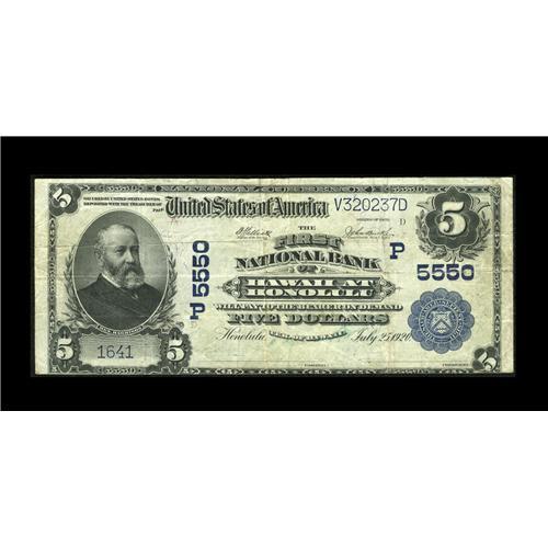 <B>Honolulu, HI</B></I> - $5 1902 Plain Back Fr. 607 <B>The First NB of Hawaii at Honolulu</B></I> Ch. # (P)5550<BR>A crispy <B>Very Fine</B></I> from the most affordable of the territorial issuers. The blue stamped signatures have faded and the lower margin is slightly cut in, but the note is quite bright and becomes the lowest serial yet documented in the census of this type and denomination. There never seem to be quite enough notes to satisfy collector demand from here. Bidding will reach the range of...