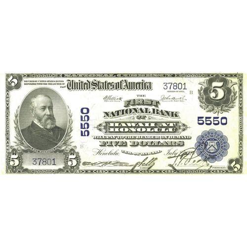 <B>Honolulu, HI</B></I> - $5 1902 Plain Back Fr. 607 <B>The First NB of Hawaii at Honolulu</B></I> Ch. # 5550<BR>A pleasing high end circulated example of what is truly the only affordable large size Territorial issue. <B>Very Fine.</B></I><BR><I>From The Plymouth Rock Collection</B></I>