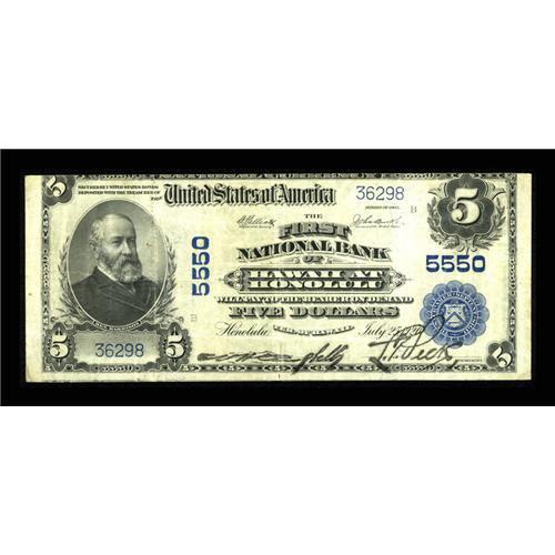 <B>Honolulu, HI</B></I> - $5 1902 Plain Back Fr. 607 <B>The First NB of Hawaii at Honolulu</B></I> Ch. # 5550<BR>A pleasing evenly circulated example of the only truly affordable large size Territorial issue. <B>Fine-Very Fine,</B></I> with the typical close top margin more than offset by the strong signatures and good paper surfaces.<BR><BR><b>Shipping:</b> Coins & Currency (<a target="_blank" href="http://www.heritageauctions.com/common/shipping.php">view shipping information</a>)