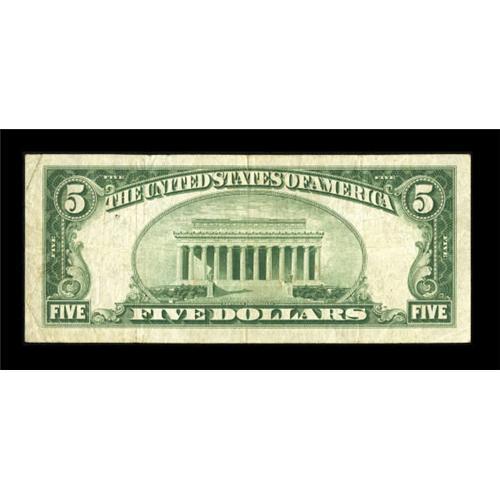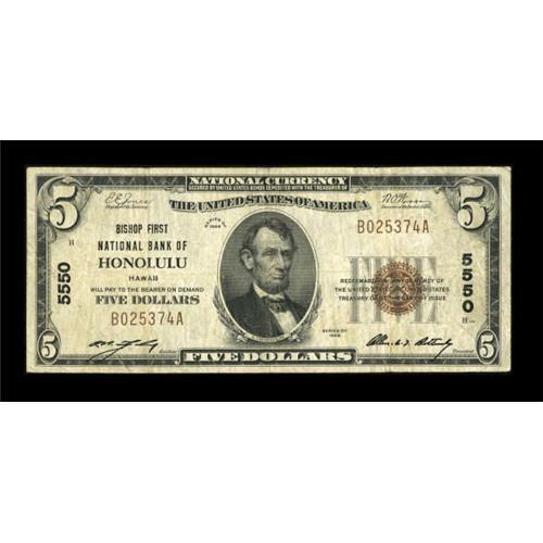 <B>Honolulu, HI</B></I> - $5 1929 Ty. 1 <B>Bishop First NB</B></I> Ch. # 5550<BR> Solid margins and moderate circulation are noticed. <B>Fine</B></I>.<BR><I>From The Kansas City Collection.</B></I><BR><BR><b>Shipping:</b> Coins & Currency (<a target="_blank" href="http://www.heritageauctions.com/common/shipping.php">view shipping information</a>)