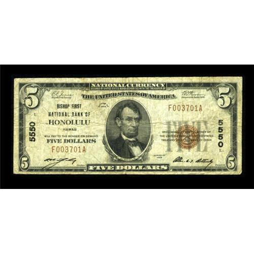 <B>Honolulu, HI</B></I> - $5 1929 Ty. 1 <B>Bishop First NB</B></I> Ch. # 5550<BR> This is always a popular bank and is sought after by collectors seeking to complete a state set. Tonight's example is a problem free <B>Fine-Very Fine. <BR></B></I><I>From The Walla Walla Collection</B></I><BR><BR><b>Shipping:</b> Coins & Currency (<a target="_blank" href="http://www.heritageauctions.com/common/shipping.php">view shipping information</a>)