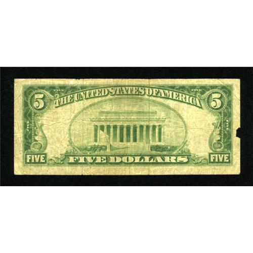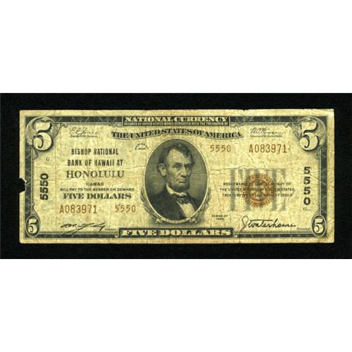 <B>Honolulu, HI</B></I> - $5 1929 Ty. 2 <B>Bishop NB of Hawaii at Honolulu</B></I> Ch. # 5550<BR> This piece is solid save for a small piece missing in the left margin. The higher denominations are more often seen from this bank. <B>Very Good.</B></I><BR><BR><b>Shipping:</b> Coins & Currency (<a target="_blank" href="http://www.heritageauctions.com/common/shipping.php">view shipping information</a>)