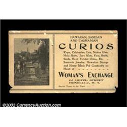 Honolulu, HI - Woman's ExchangeAdvertising card from this merchant that specialized in Hawaiian, Samoan and Tasmanian curios. Very Fine overall, but with small pieces missing from the two bottom corners. Important notice: We expect to be auctioning lots at the rate of 200-250 per hour. Sometimes eBay Premier live bid software cannot keep up with that pace, so we strongly recommend that you place a realistic proxy bid now as insurance to avoid disappointment. Also please note that all Heritage/CAA lots purchased through eBay Premier carry a 20% Buyer's Premium. Please make sure you read the Terms and Conditions.
