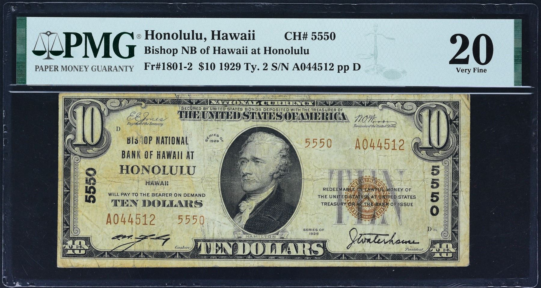 Title: Honolulu, Hawaii - $20 1929 Type 2 Fr. 1801-1 Bishop First National Bank of Honolulu Ch. # 5550 PMG Very Fine 20