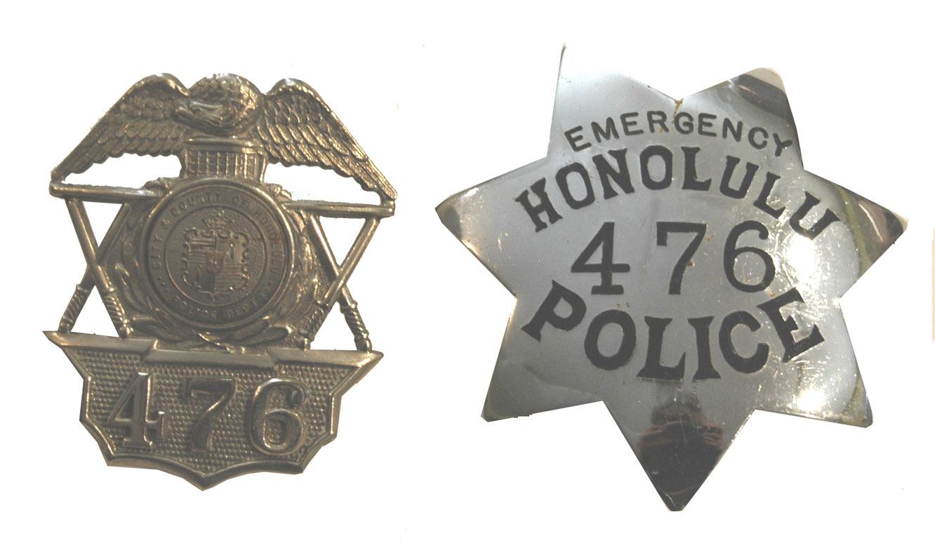 Lot of two Honolulu Police badges. Seven-point silver-tone star badge reads, ''Emergency Honolulu Police 476.'' Pin and roller closure on back. Measures approximately 2.75'' from tip to tip. Silver-tone eagle badge reads, ''City & County of Honolulu Police Department / 476.'' Screw closure to back. Measures approximately 2'' x 2.5''. Some scratching to star badge, otherwise both in excellent condition.