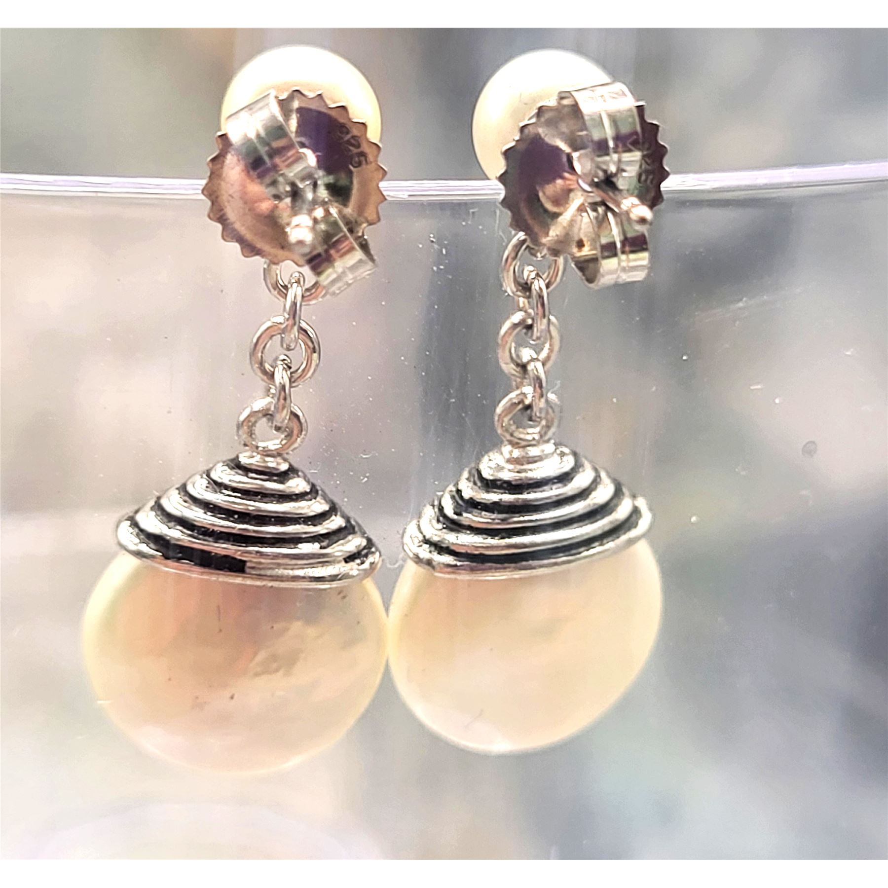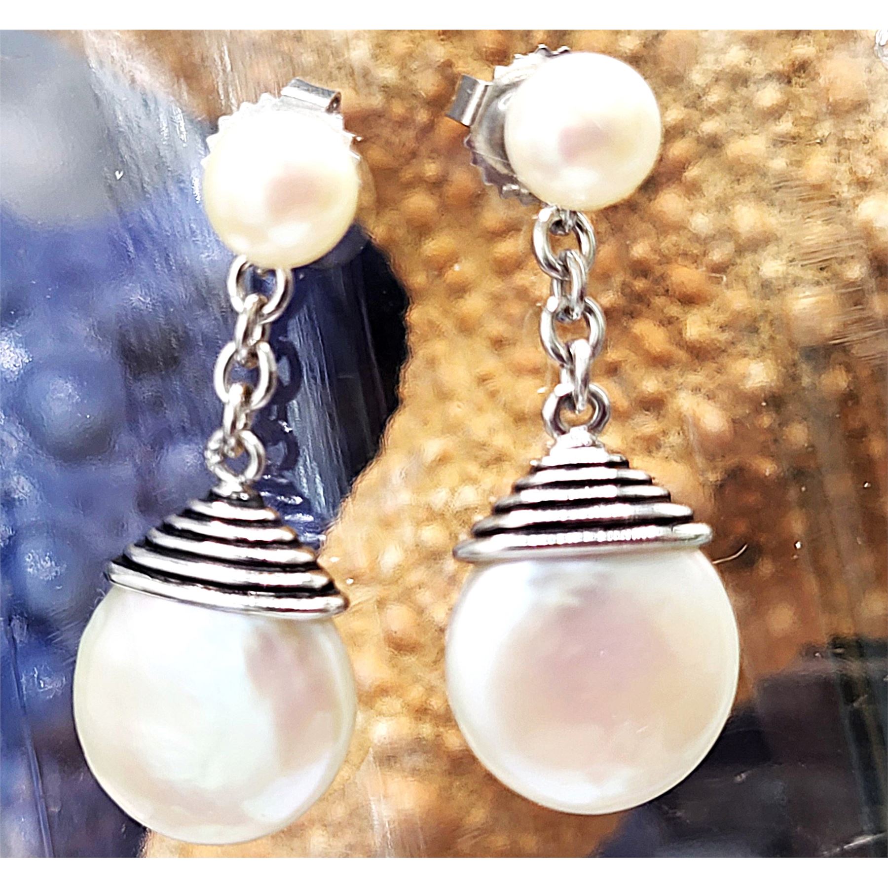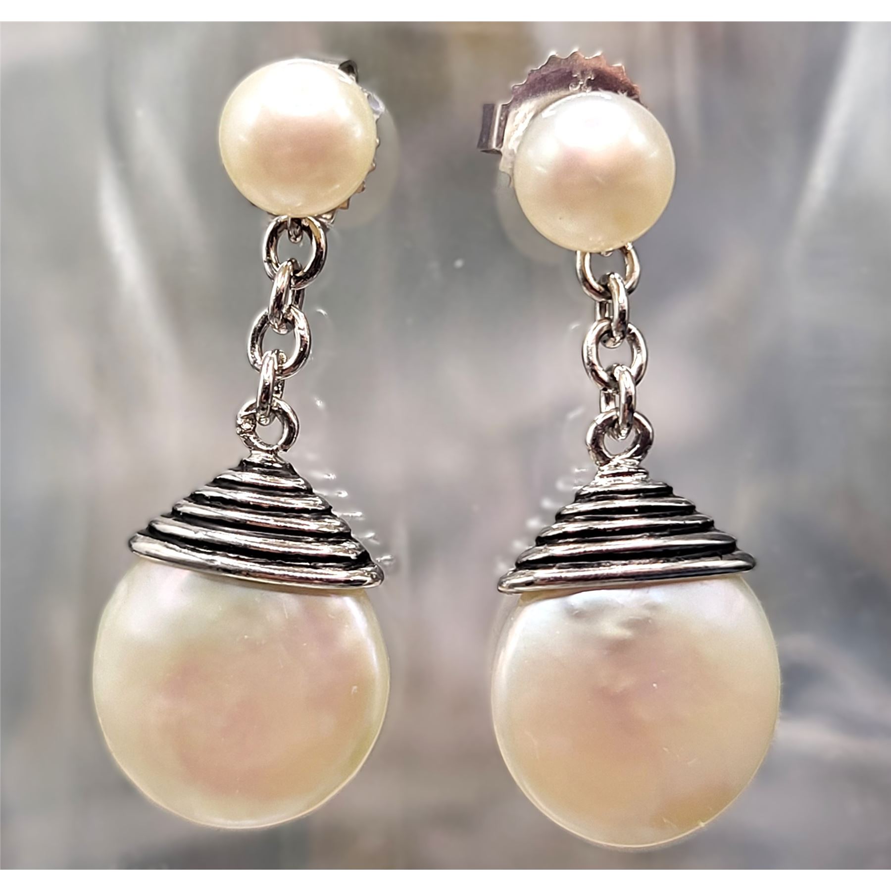 This pair of sterling silver earrings is a great estate find!& nbsp; They are in very good condition with lustrous pearls and the ORIGINAL backs!* The earrings feature a combination of coin and drop pearls. The creamy coin pearls have a silvery pink and green iridescence, measure approximately 12.25mm x 5mm and have a ridged pearl cap lined with black enamel. They dangle from shiny sterling silver link chains that are attached to soldered rings on the pearl cups of drop pearls that radiate with rose' pearlescence.The earrings are approximately 1& quot; long and attach to the earlobes with posts and very nice friction backs. The Honora hallmark is stamped on the posts and backs of the earrings.& nbsp;
