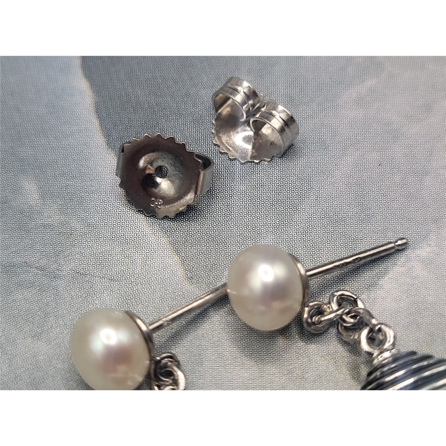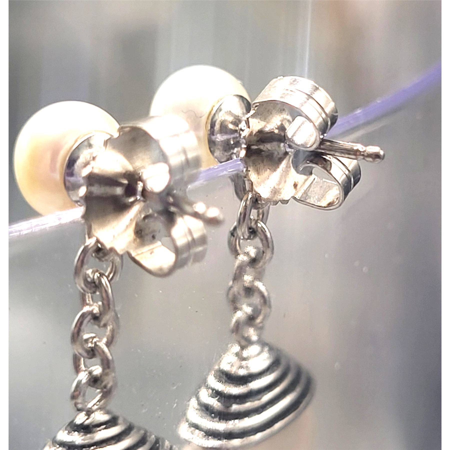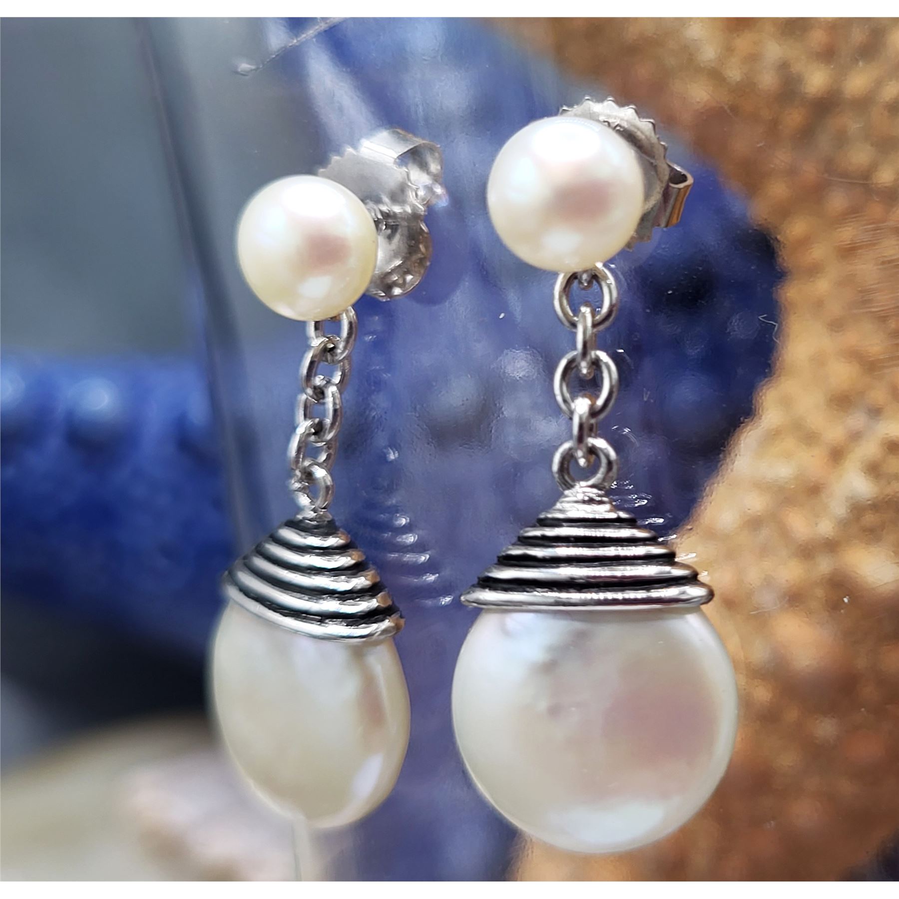 This pair of sterling silver earrings is a great estate find!& nbsp; They are in very good condition with lustrous pearls and the ORIGINAL backs!* The earrings feature a combination of coin and drop pearls. The creamy coin pearls have a silvery pink and green iridescence, measure approximately 12.25mm x 5mm and have a ridged pearl cap lined with black enamel. They dangle from shiny sterling silver link chains that are attached to soldered rings on the pearl cups of drop pearls that radiate with rose' pearlescence.The earrings are approximately 1& quot; long and attach to the earlobes with posts and very nice friction backs. The Honora hallmark is stamped on the posts and backs of the earrings.& nbsp;