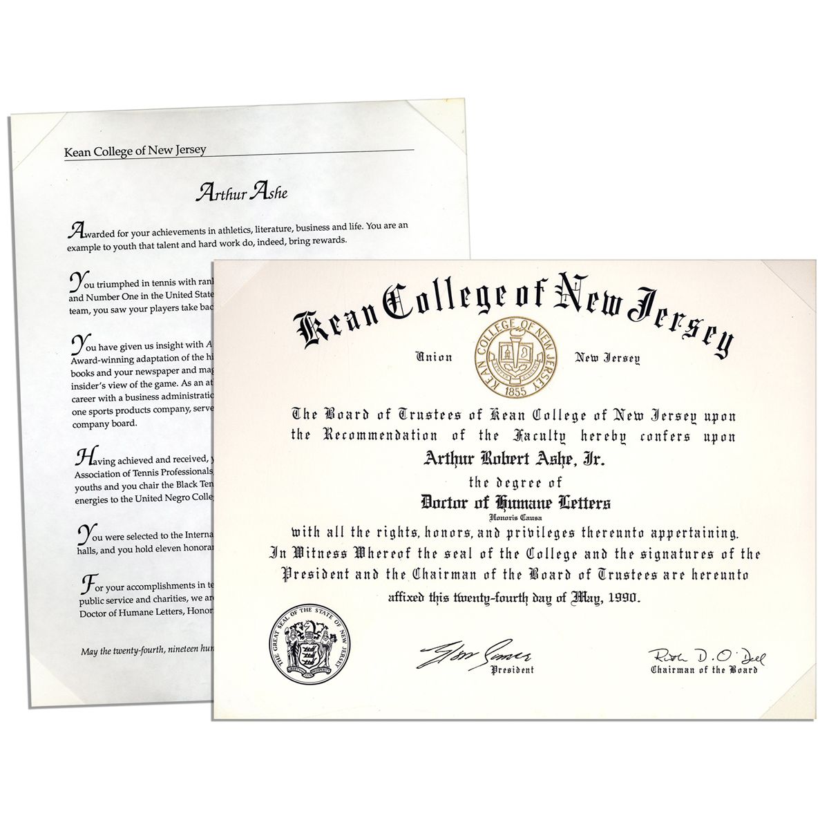 Honorary degree from Kean College presented to Arthur Ashe during commencement exercises on 24 May 1990. Degree bestows Ashe with ''Doctor of Humane Letters.'' Degree is housed in a teal leather folder and measures 11.5'' x 9''. Accompanied by a second leather folder containing a one-page biography of Ashe and the commencement booklet from 1990. Overall near fine condition. With an LOA from Ashe's widow.